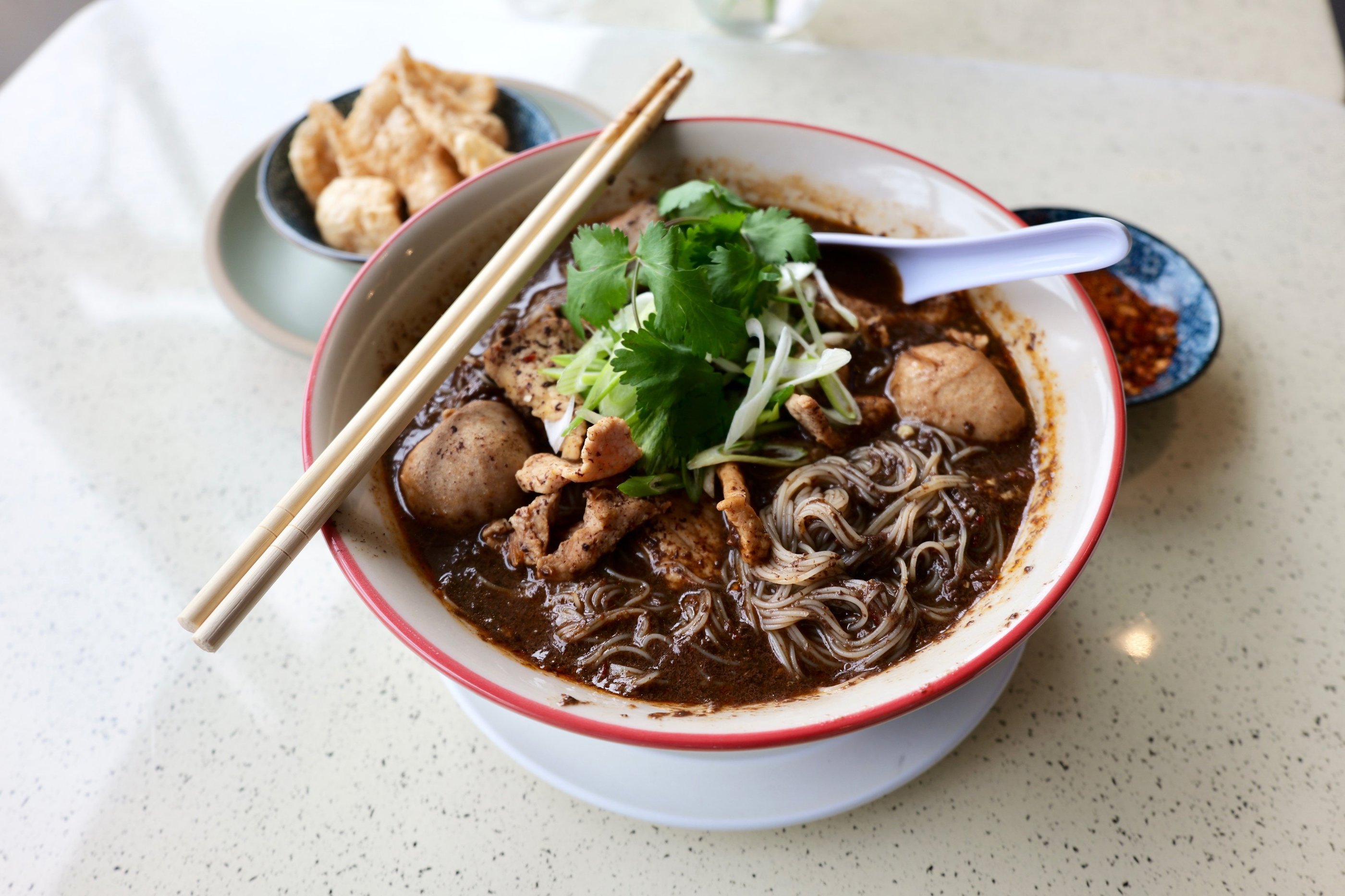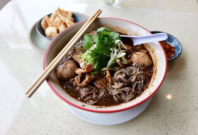 Classic Thai Boat Noodles - simmered with herbs and spices, served with tender beef, meatballs, rice noodles, and fresh herbs
