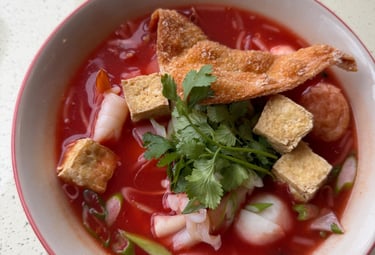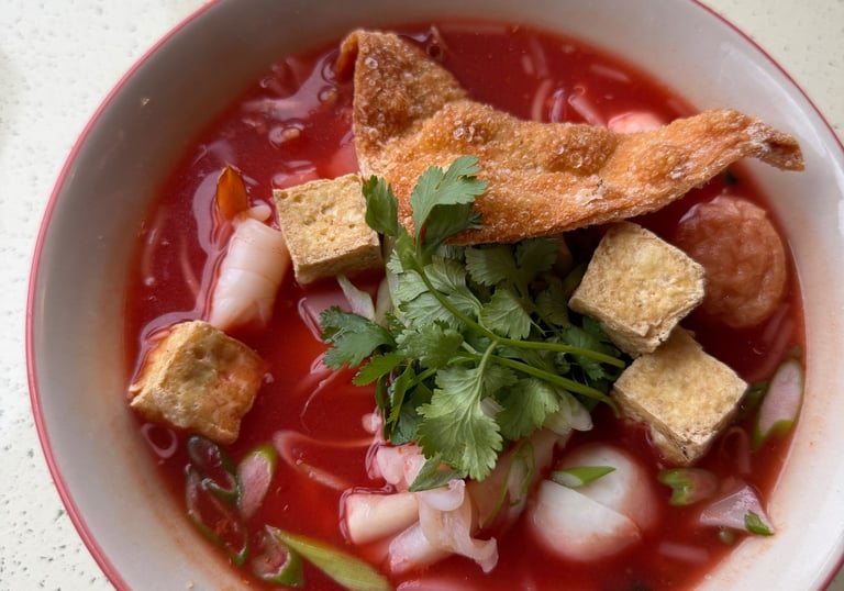 Yentafo - Thai styled noodles soup in a signature pink fermented tofu broth, served with wide rice noodles, seafood, fish balls, and crispy wonton